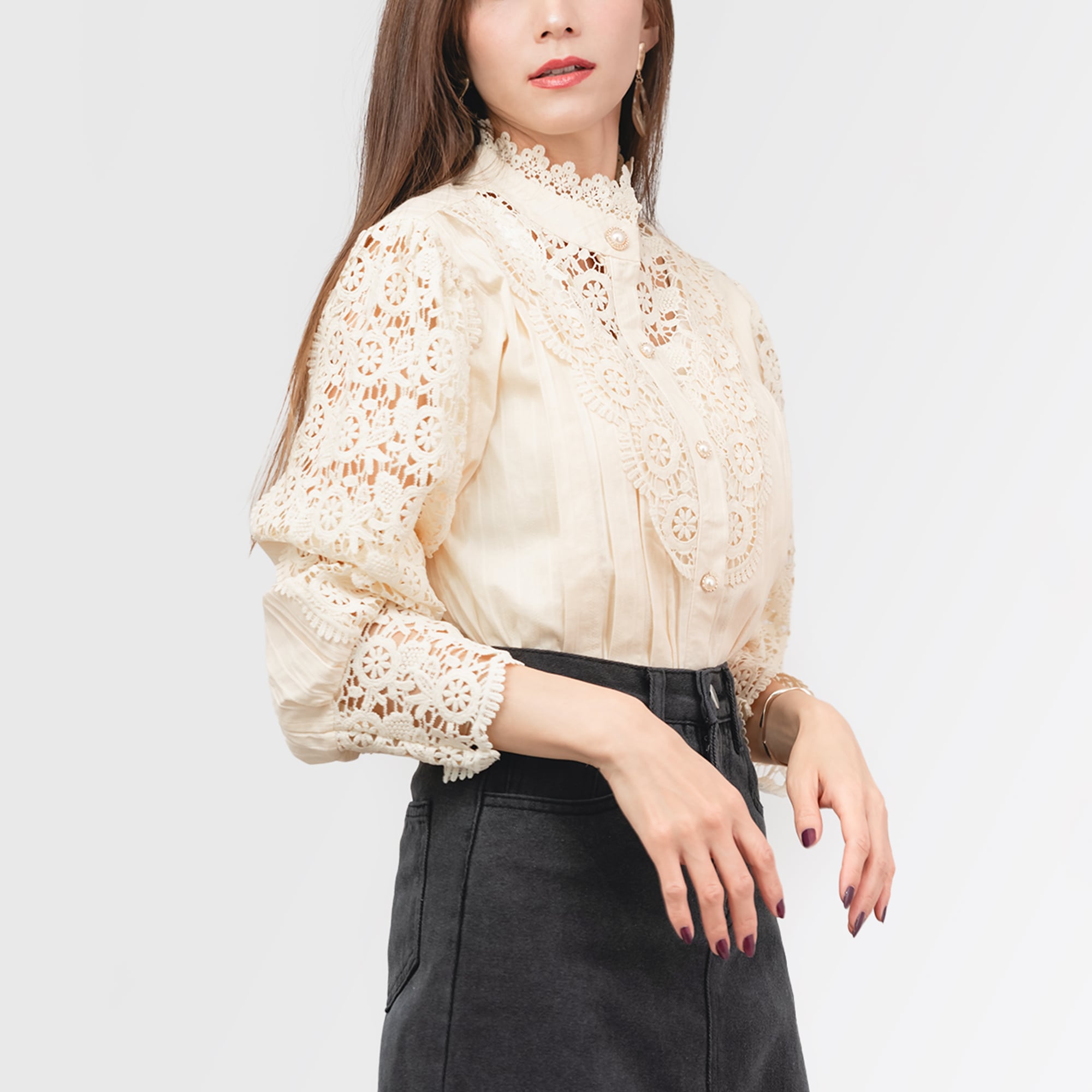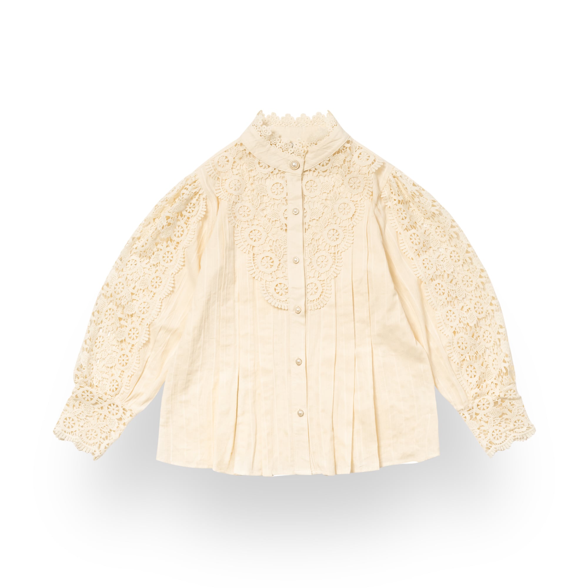 スタンドカラーから胸元、袖口にかけてほどこされたレースが、上品な華やかさを演出。