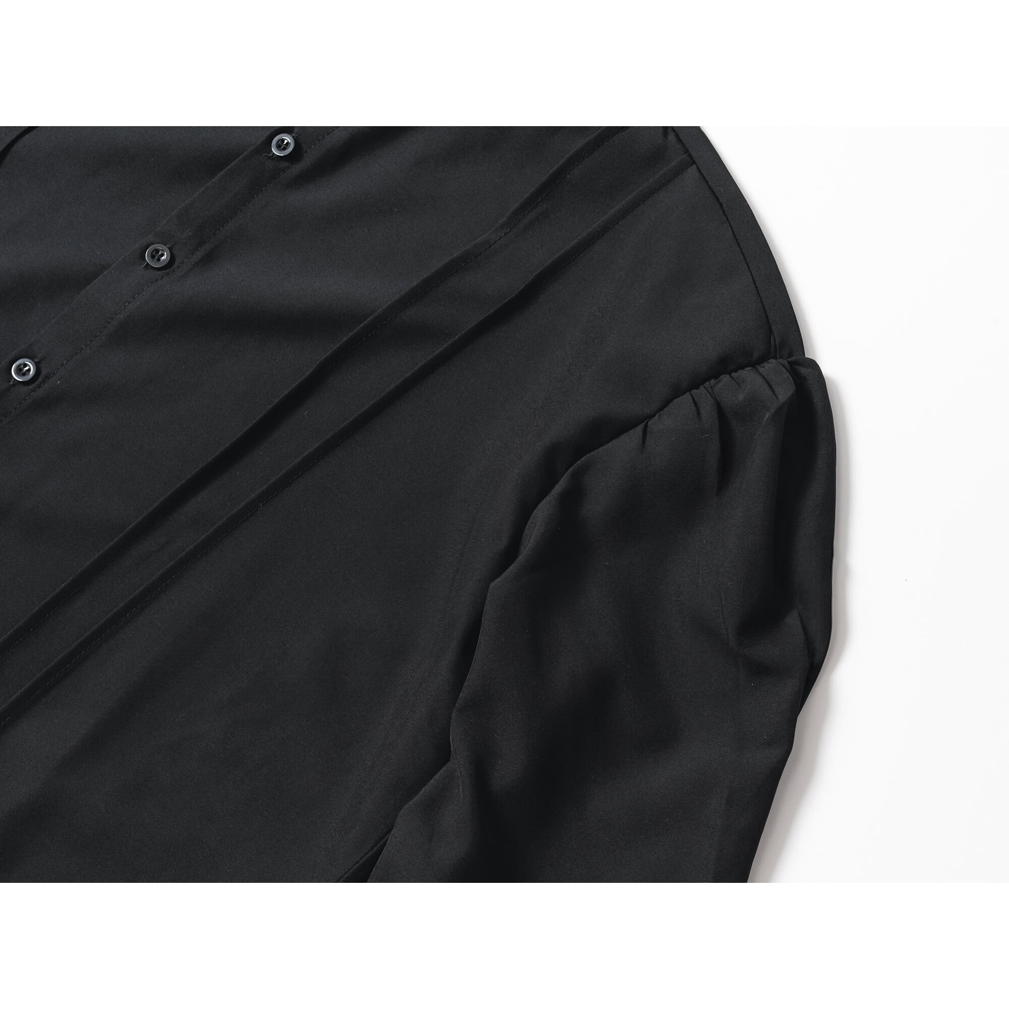 首元を立体的に彩るスタンドカラーと、袖口・ショルダーに寄せたプリーツが上品な陰影を生む一枚。