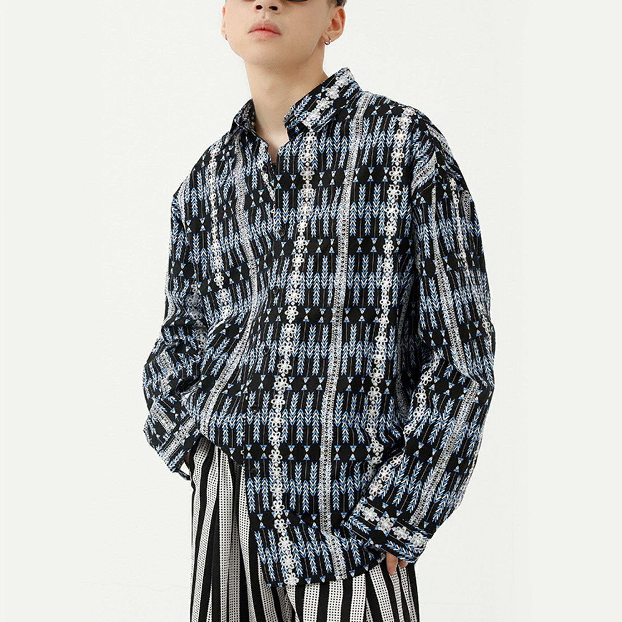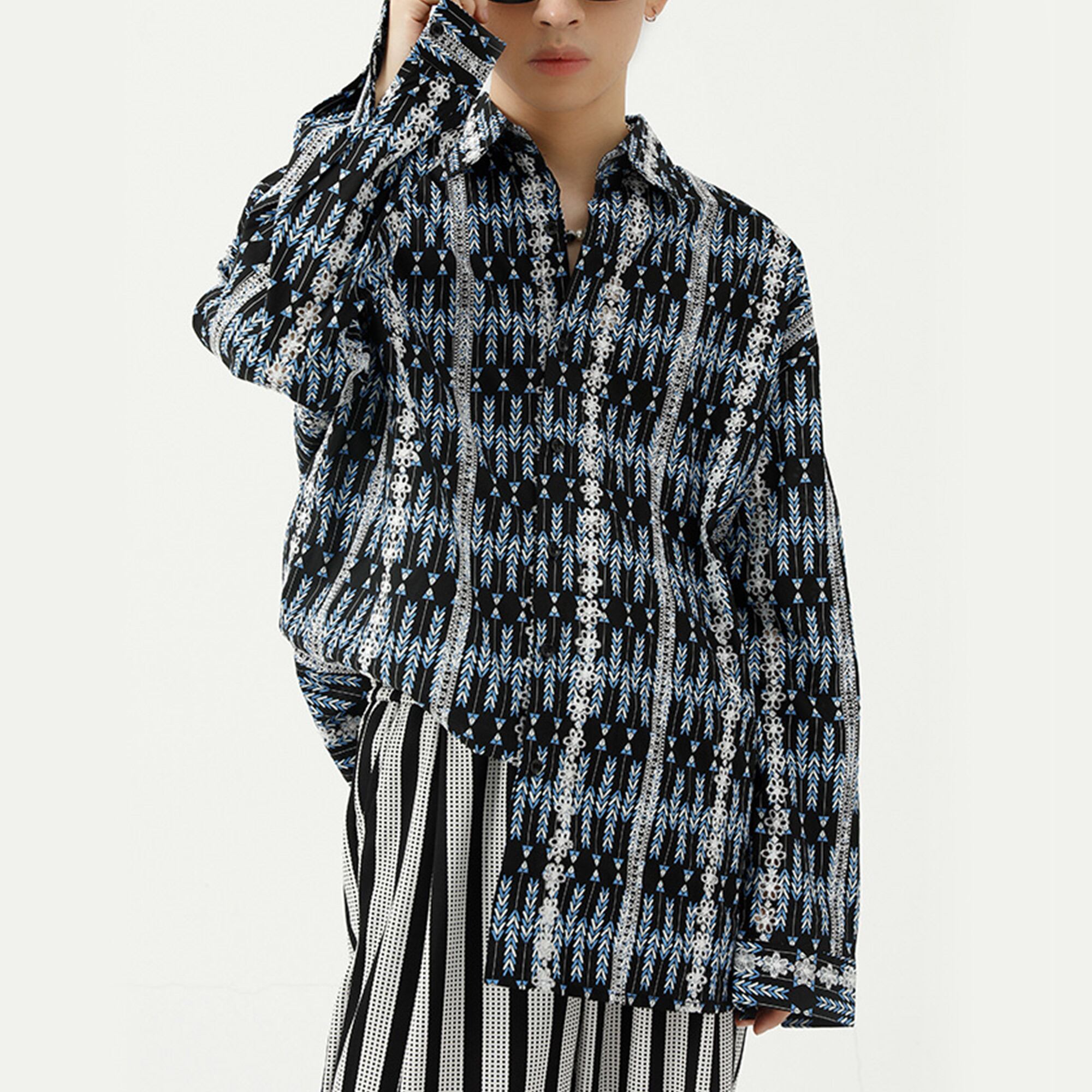 ネイティブとストライプをミックスしたパターンが人目を引くデザインのシャツ。