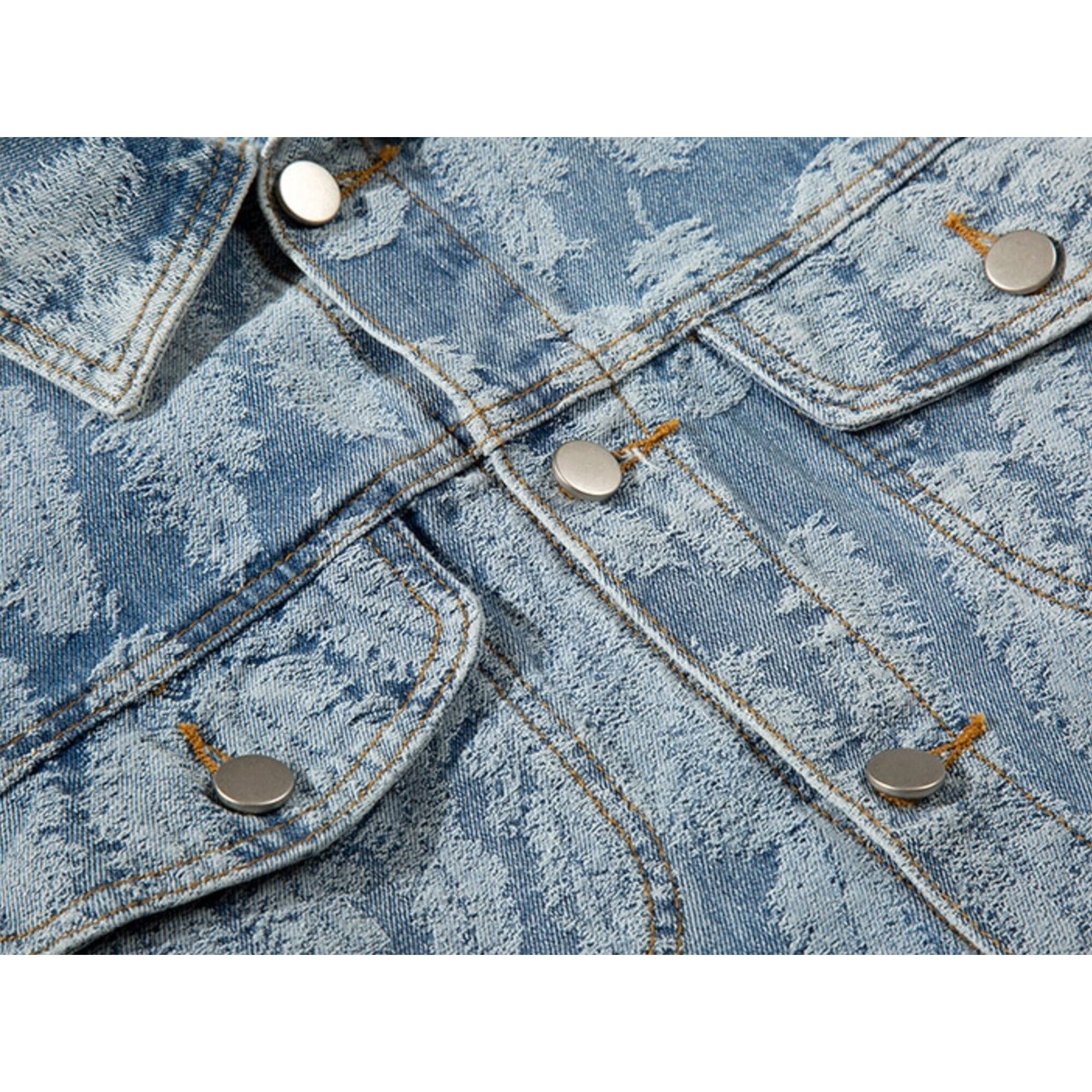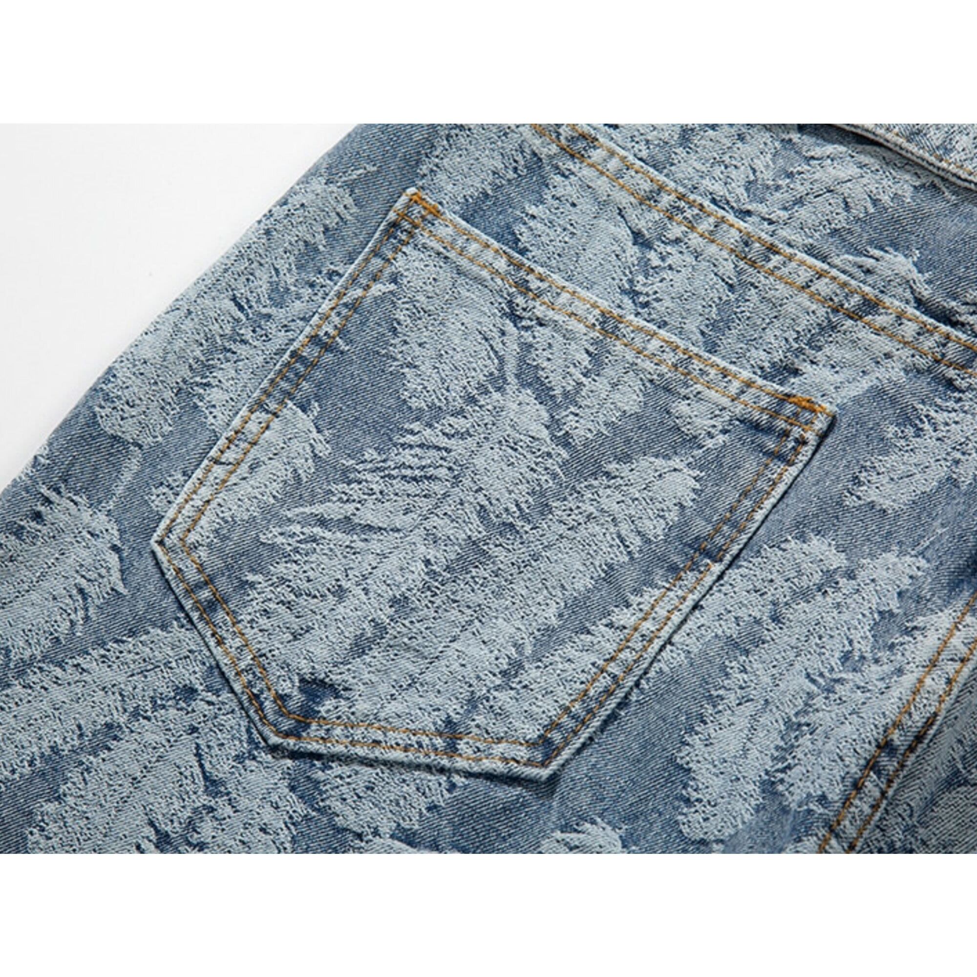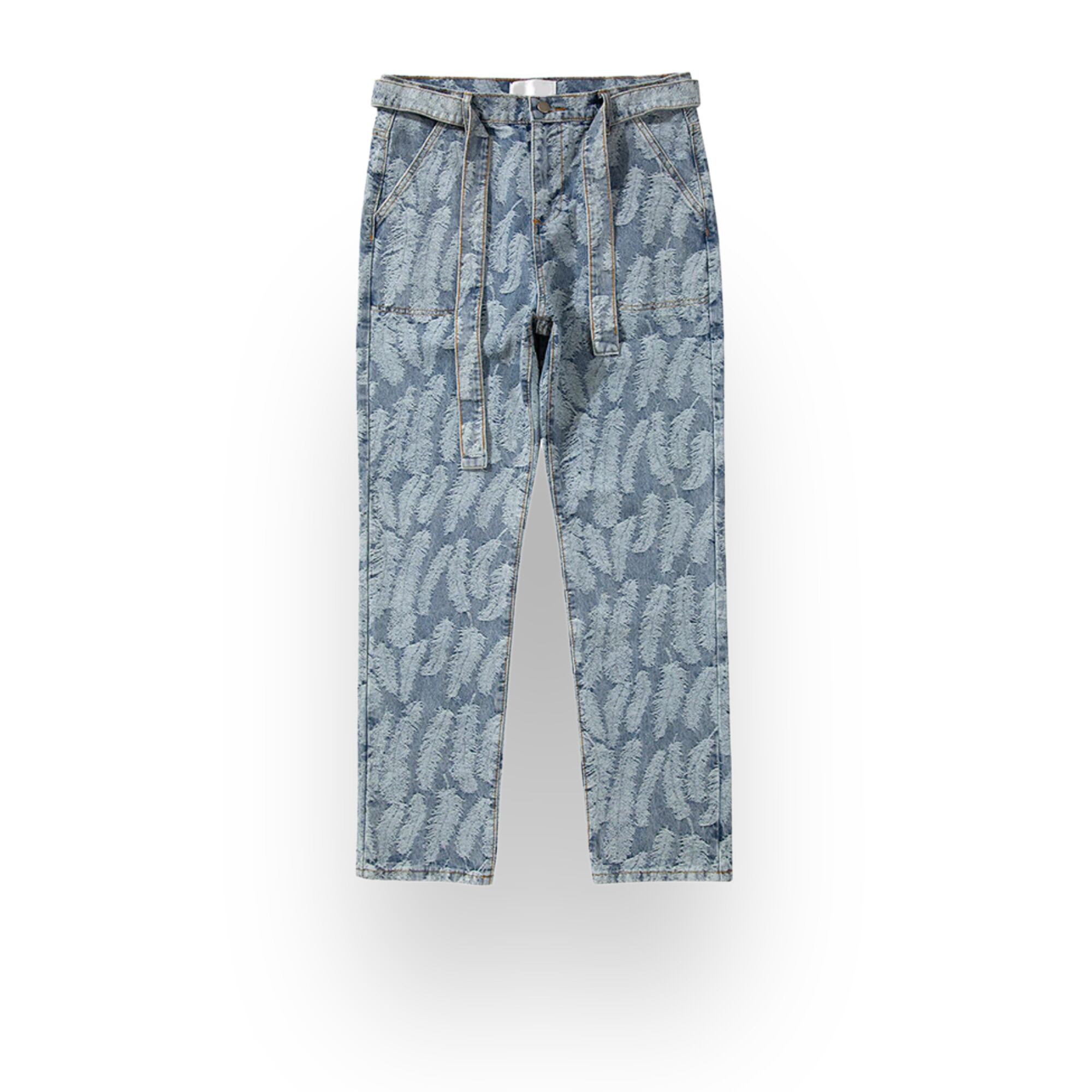 フェザーパターンをダメージ加工でほどこしたデニムディテールがラグジュアリーな印象のセットアップ。