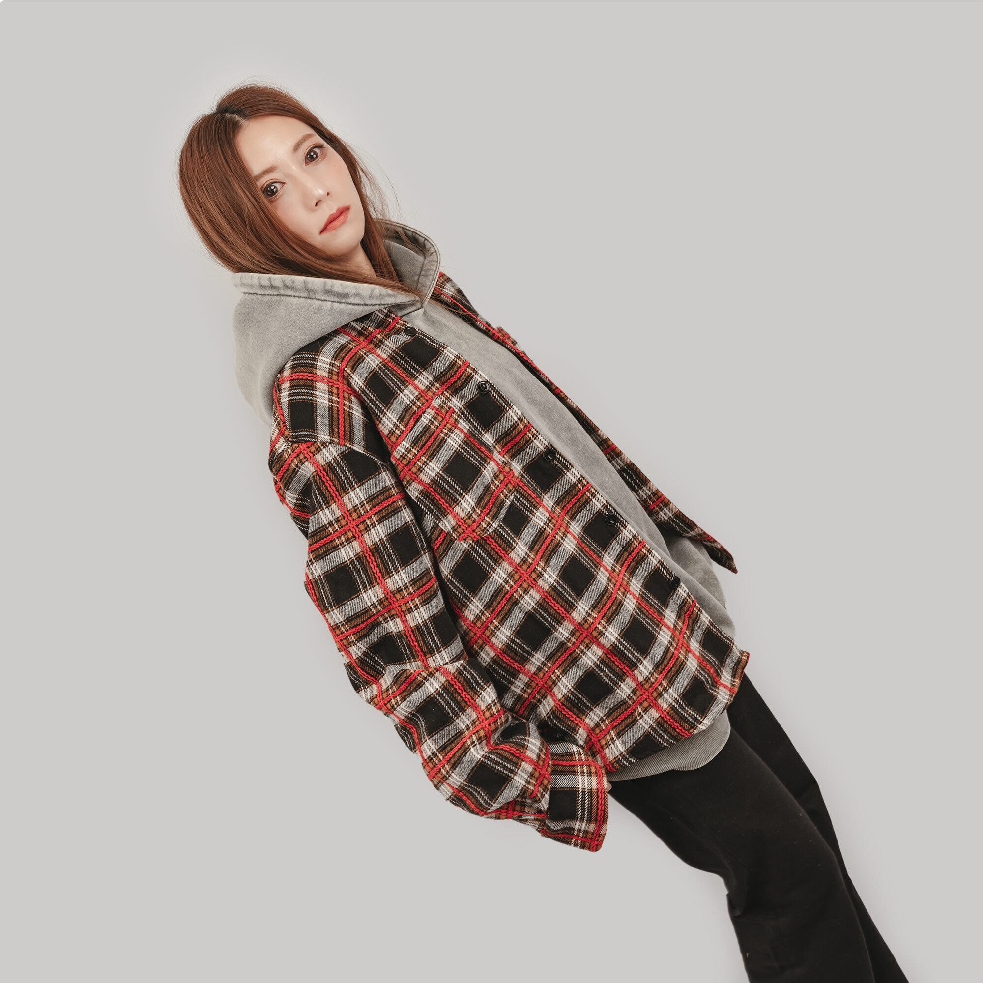 ブラックやホワイトのチェック柄に、レッドの立体的にほどこされたケーブルラインが印象的なレトロモチーフシャツ。