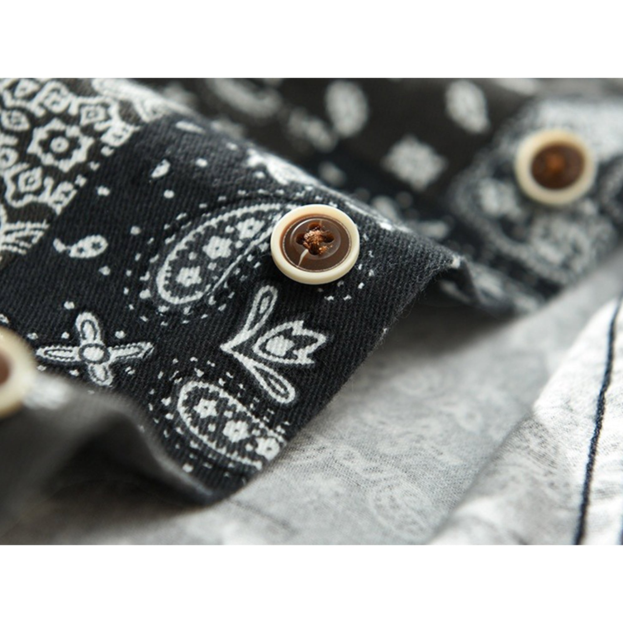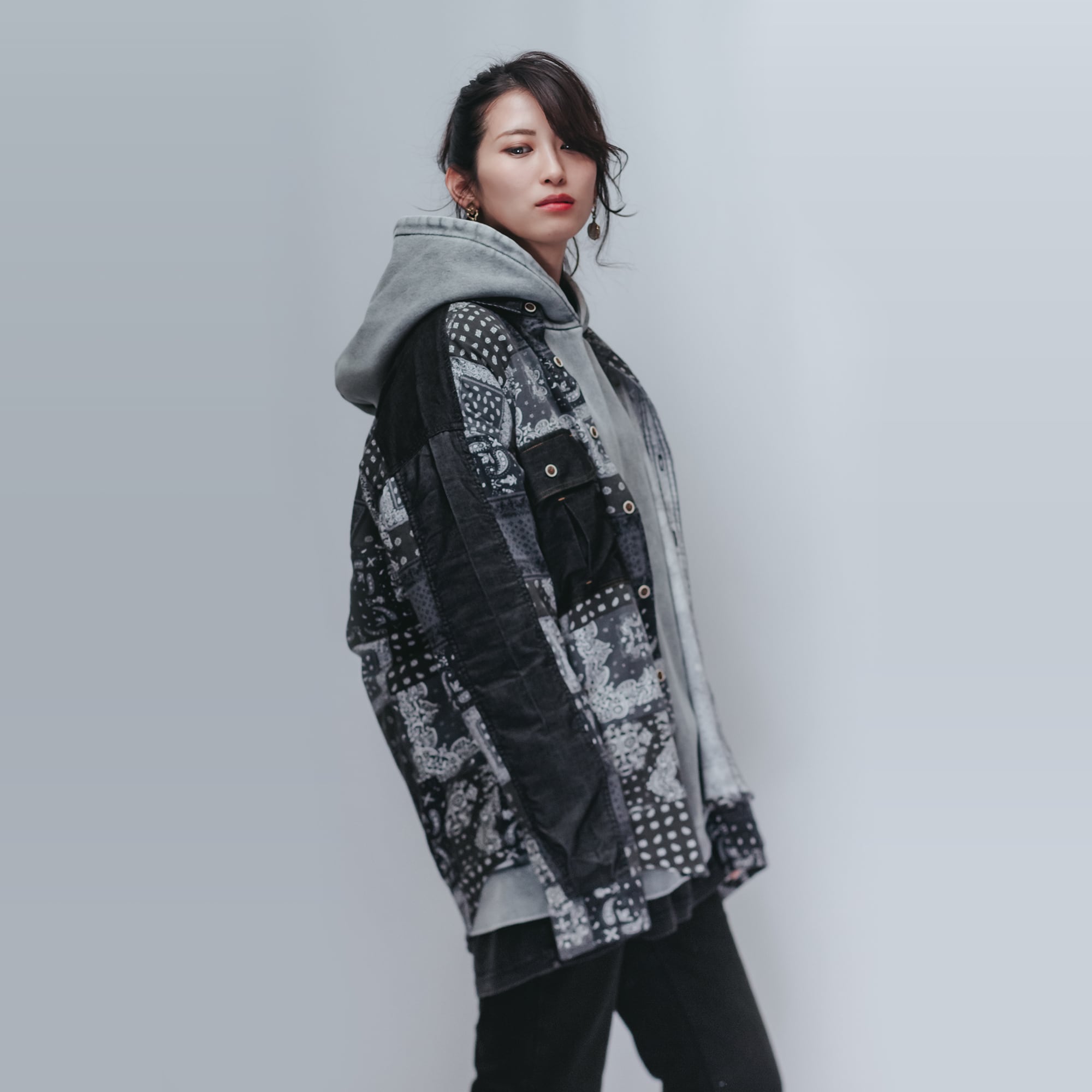 ダークカラーのペイズリーパターンに、ショルダーからスリーブにかけてパッチワークされたデニムモチーフのディテールが印象的なシャツ。