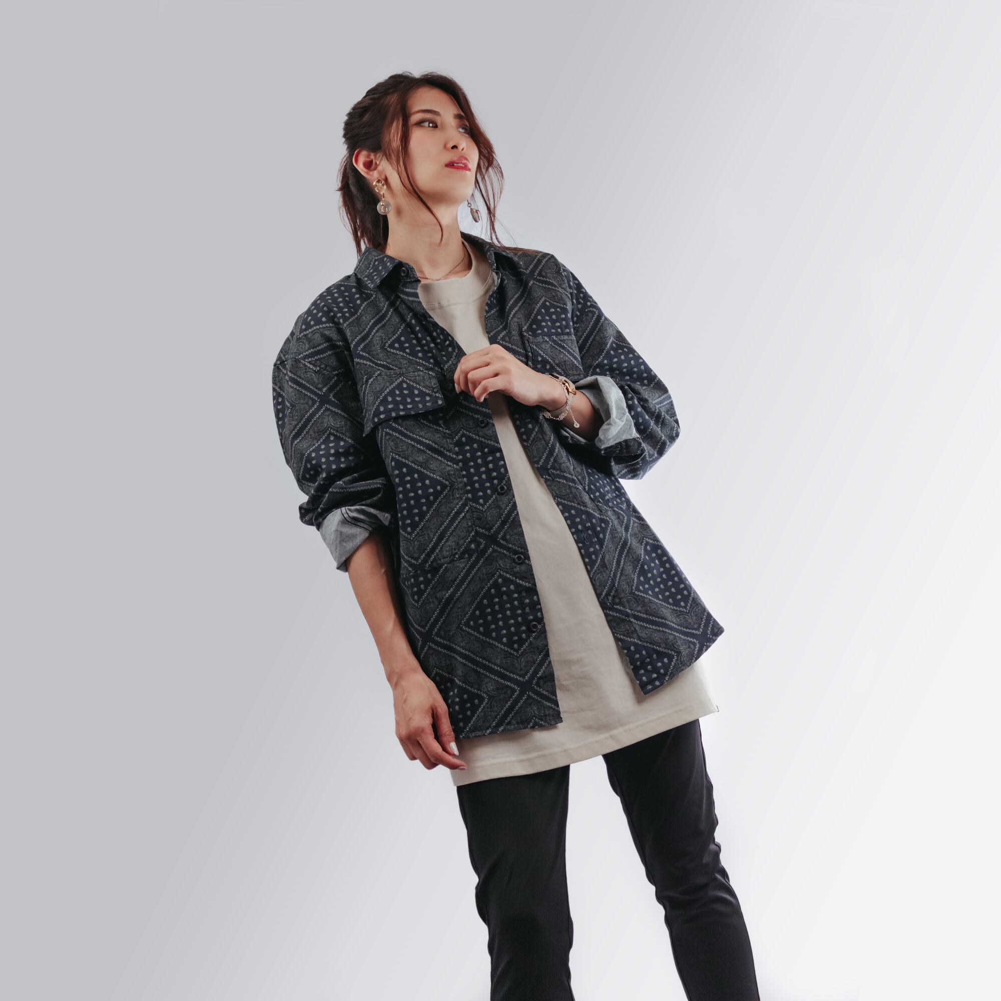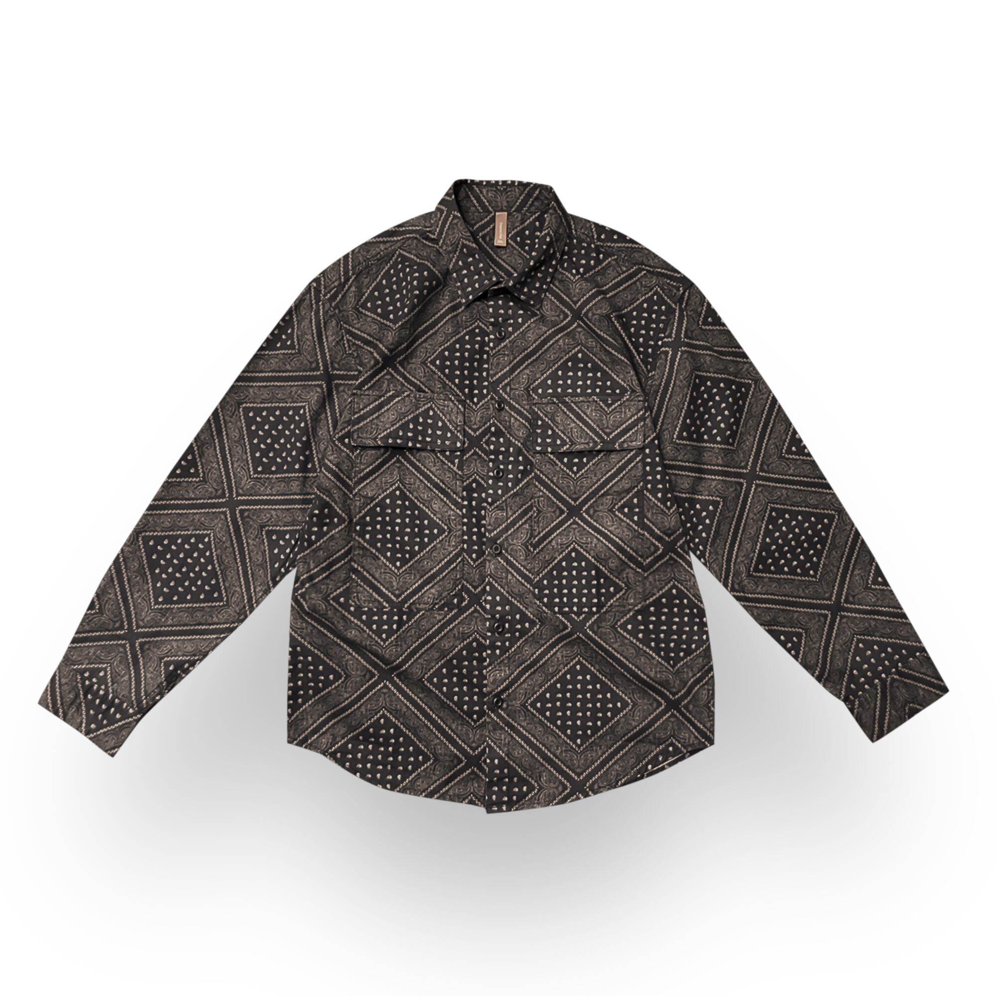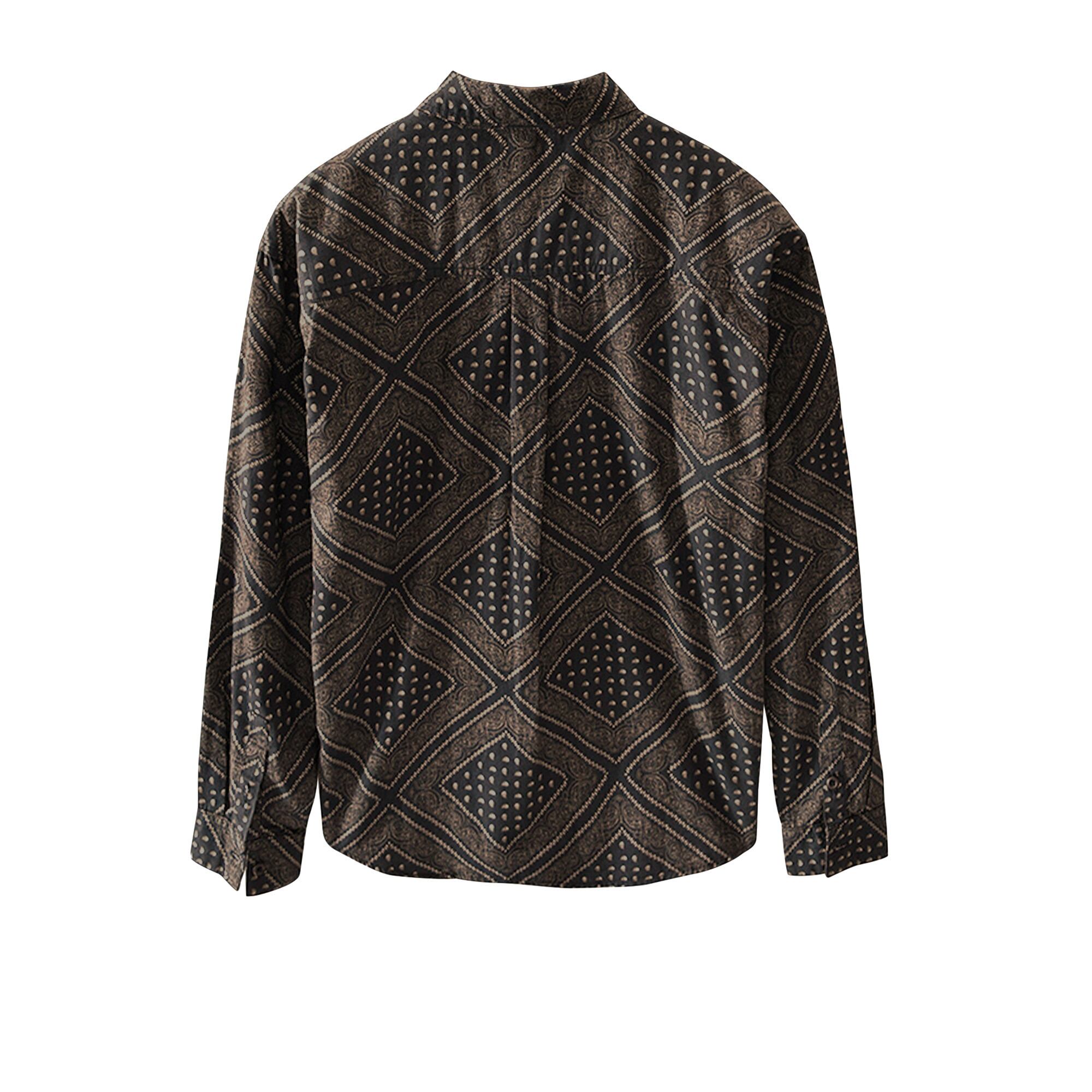 【グレー】と【ブラウン】のダークカラーに、菱形のペイズリー柄が引き立つレトロな雰囲気のシャツ。