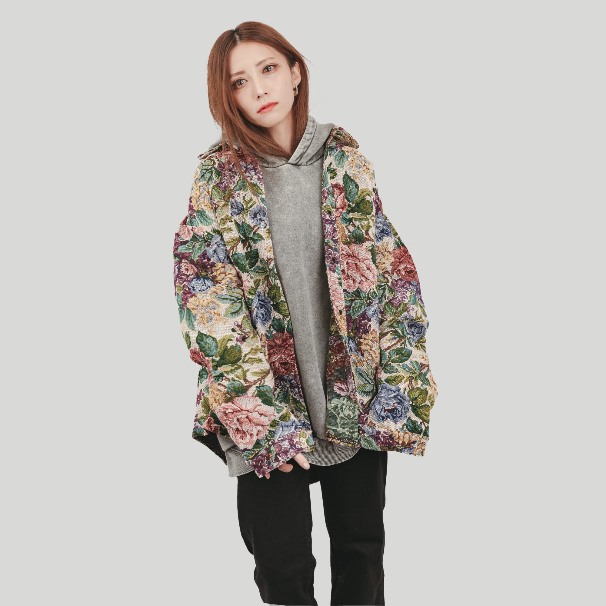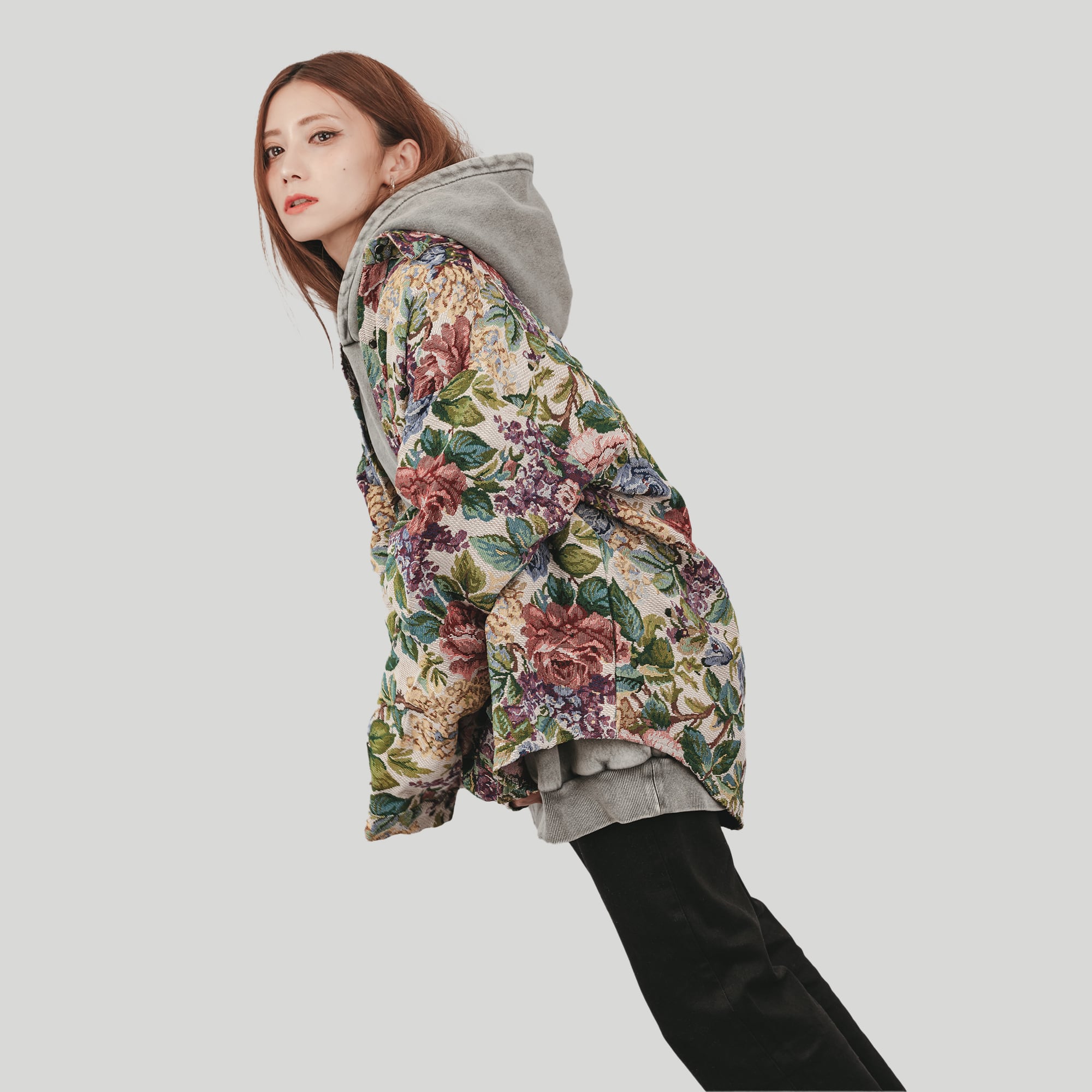 マルチカラーのフラワーパターンがほどこされたディテールが存在感溢れるシャツ。