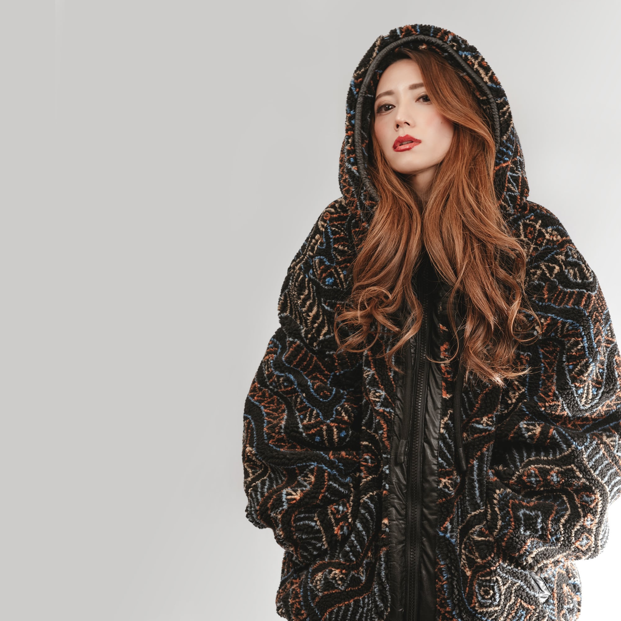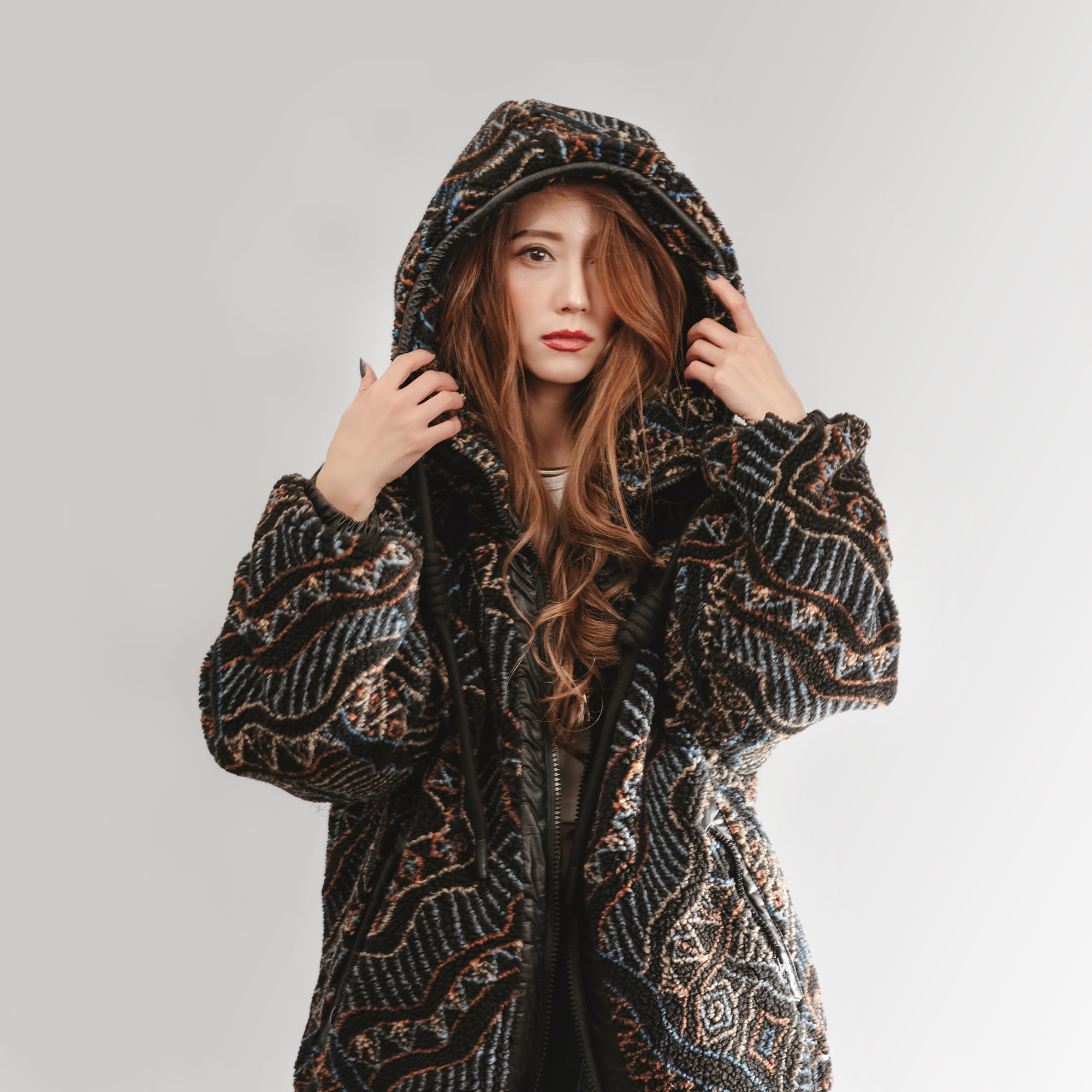 ベージュやブルーのネイティブパターンとボアのディテールが印象的なアウターフーディ。