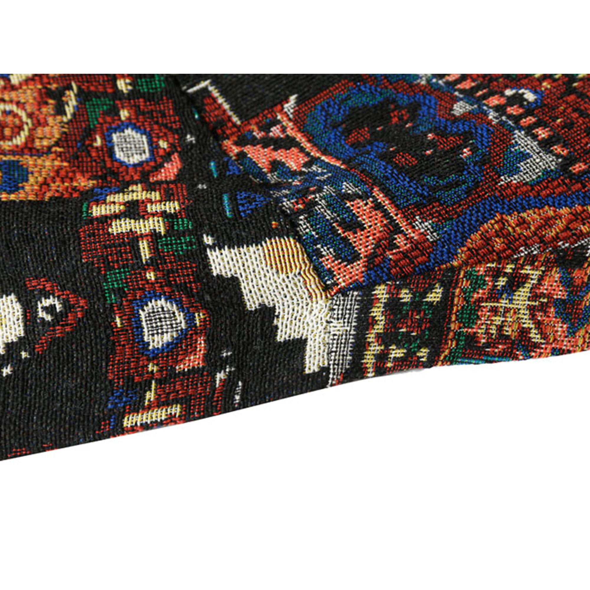 多様な幾何学柄がレトロな配色でデザインされたパターンが印象的なシャツ。