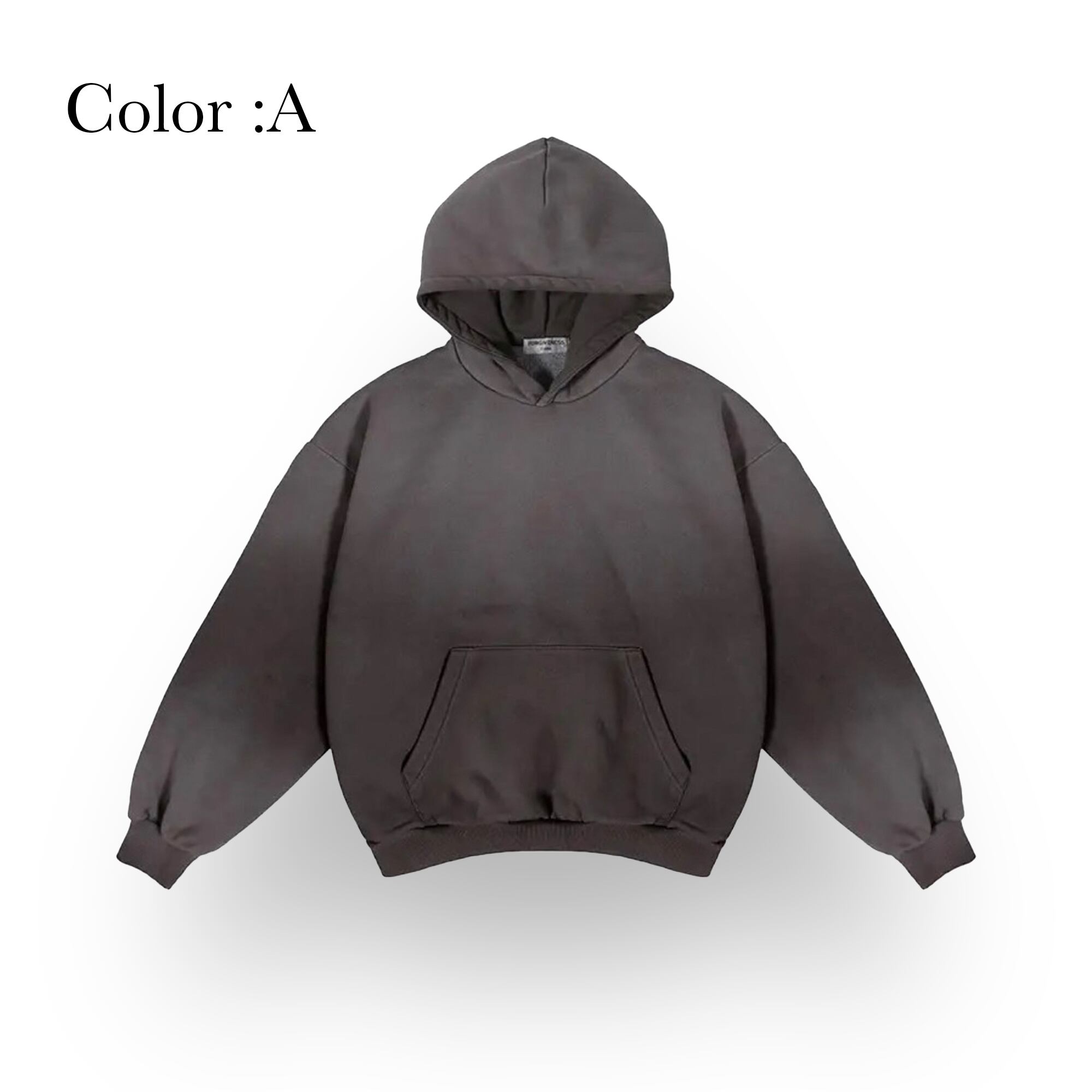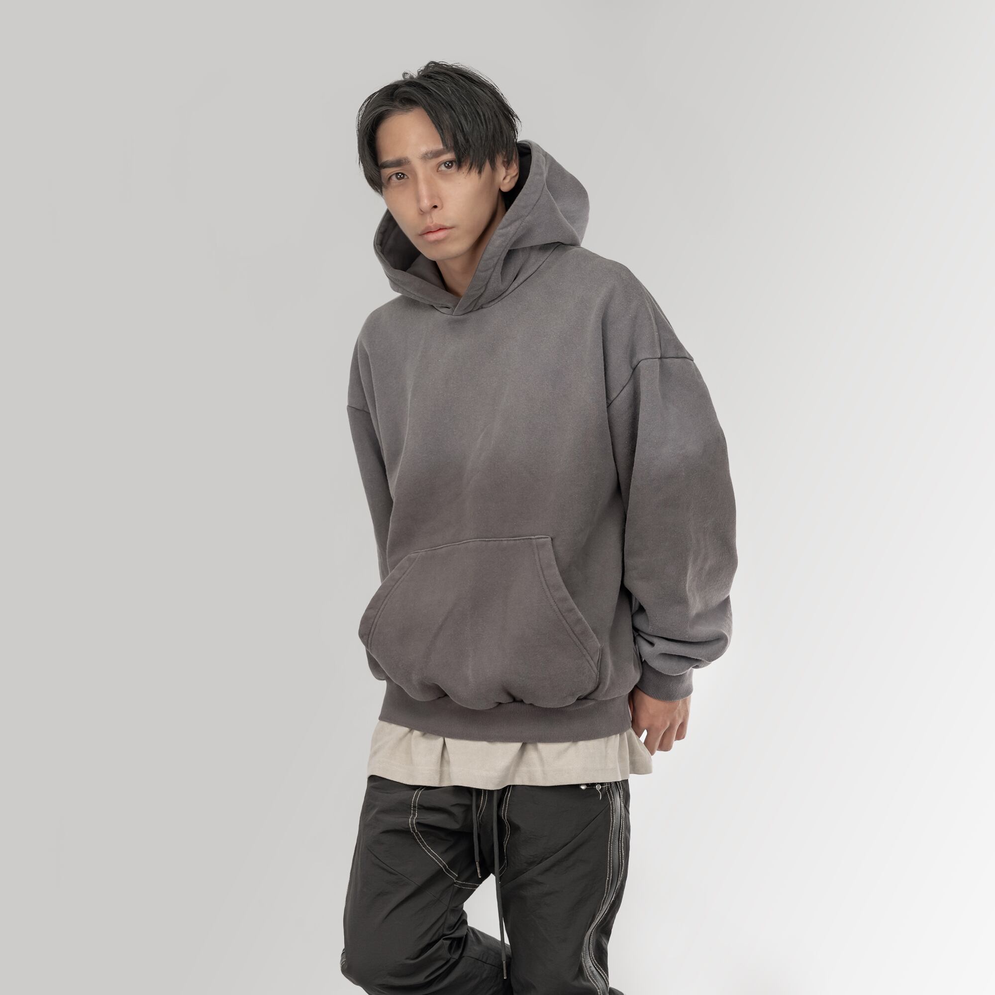 バスト部分の陰影が鮮やかで印象的なグラデーションのプルオーバーフーディ。