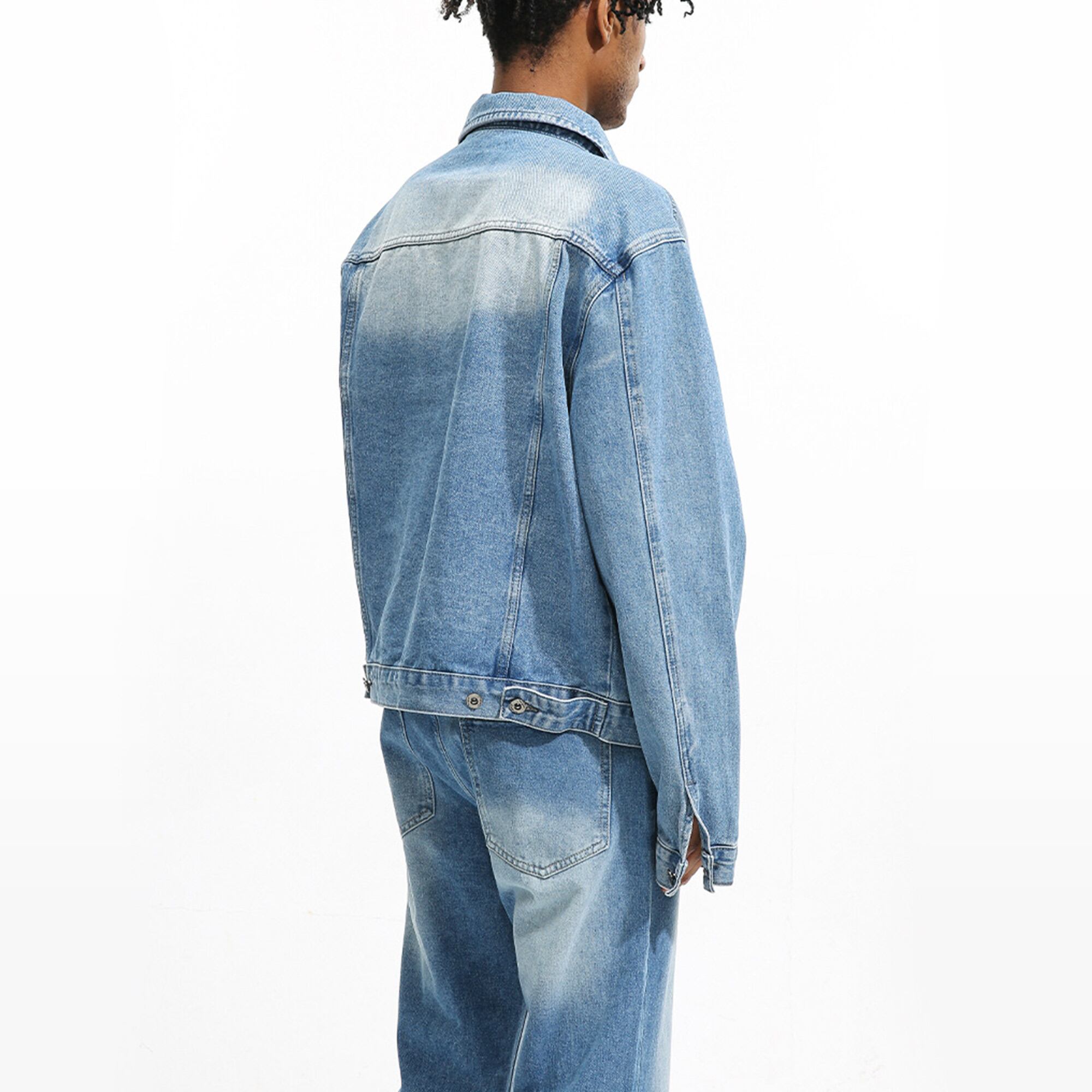 鮮やかなデニムブルーにウォッシュド加工でレトロな風合いが印象的なセットアップ。