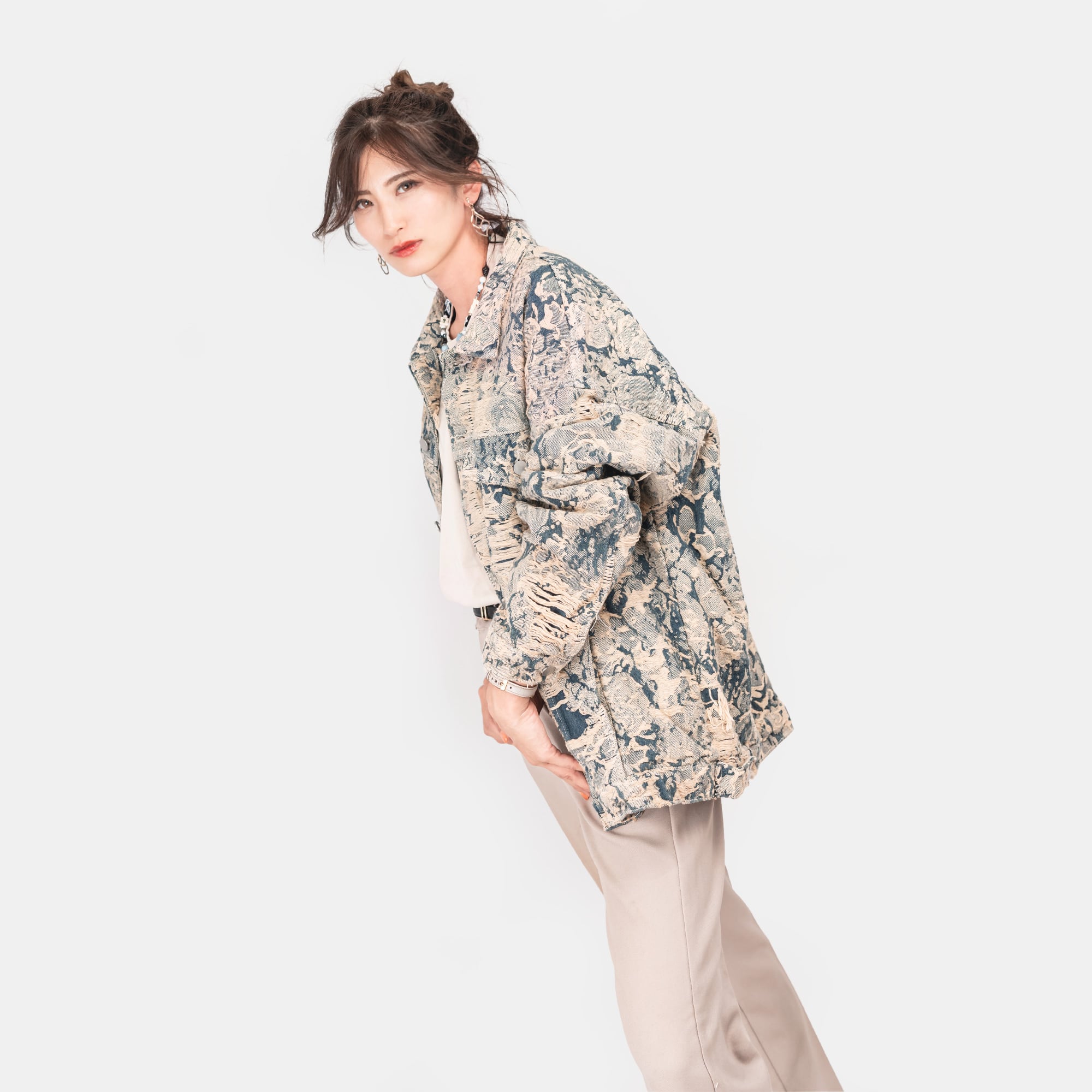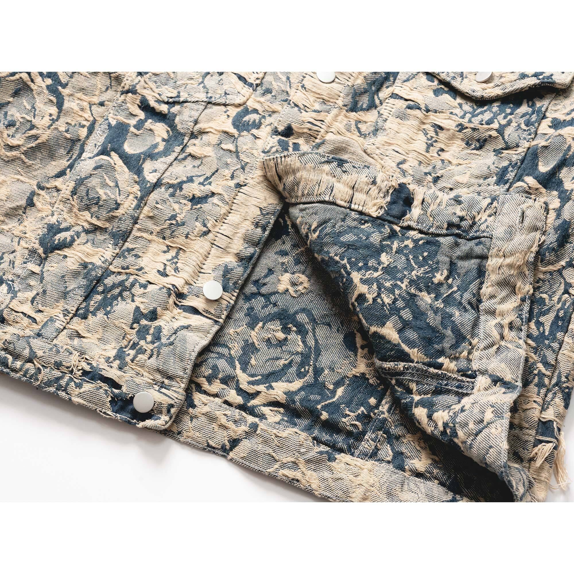 デニムブルーの花柄と淡いカラーにデザインされたクラッシュ加工が人目を引くデニムジャケット。