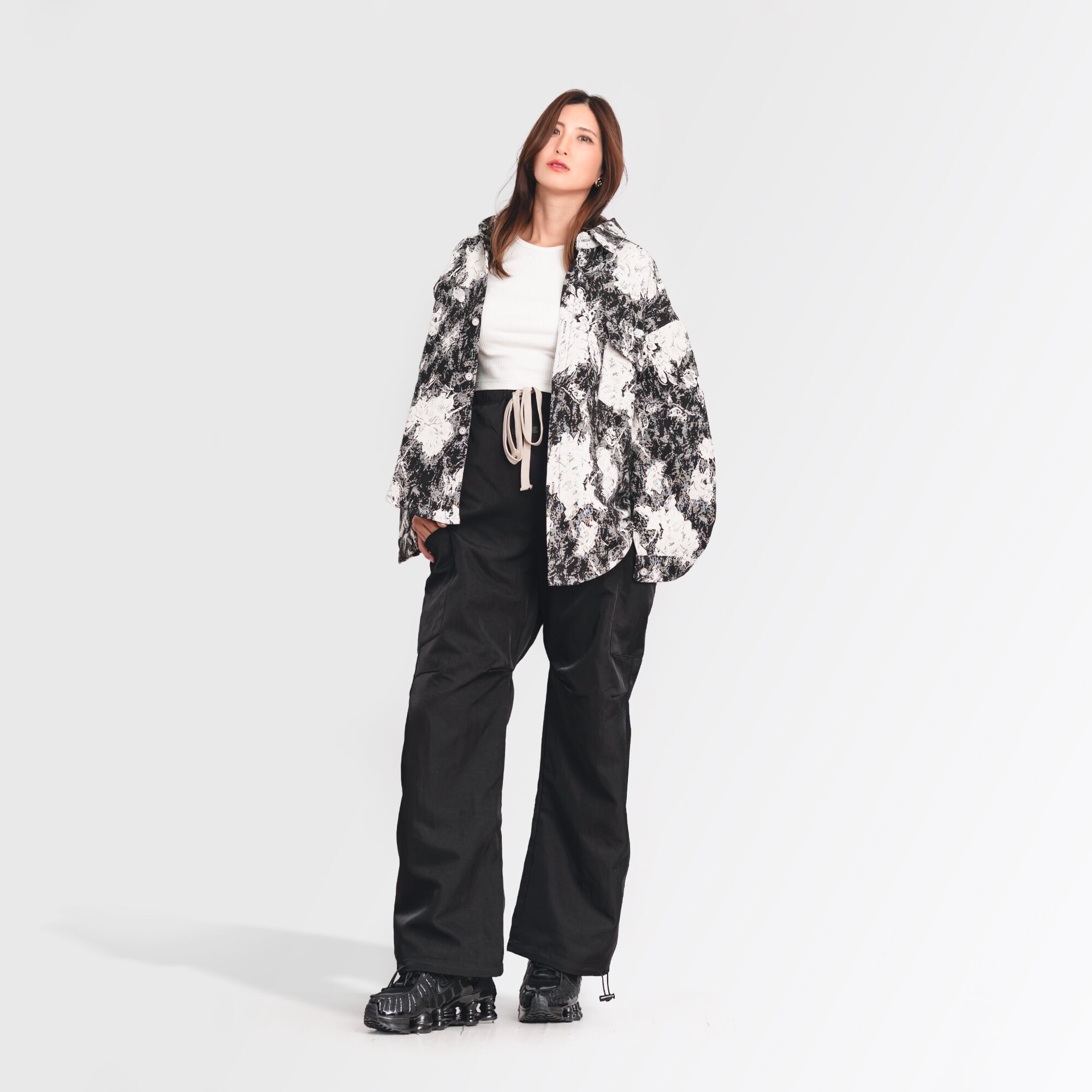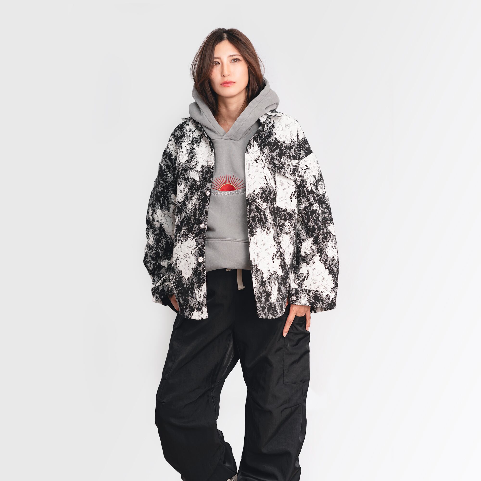 ホワイトとブラックのコントラスト鮮やかなフラワーパターンが印象的なデザインシャツ。