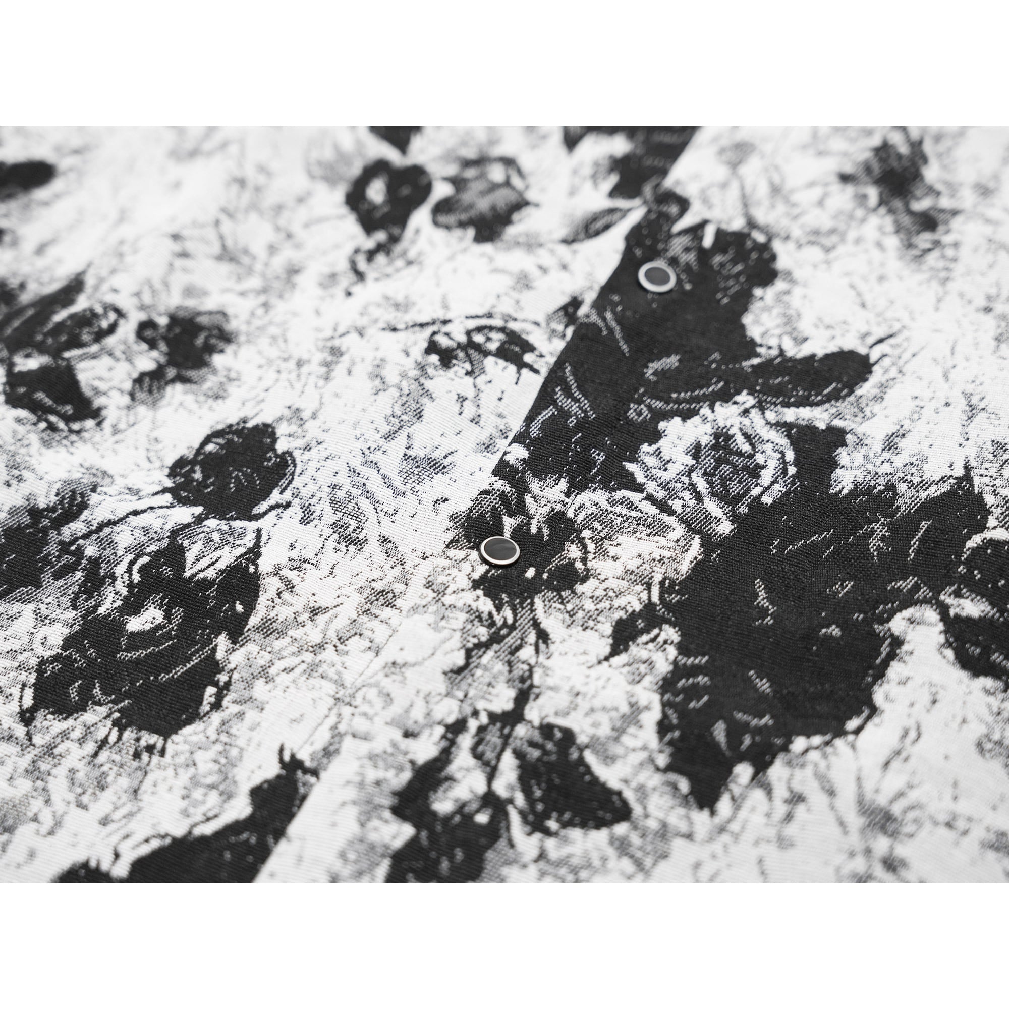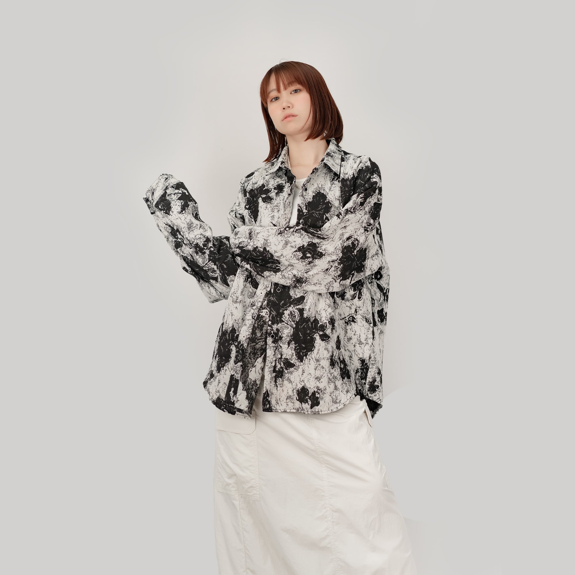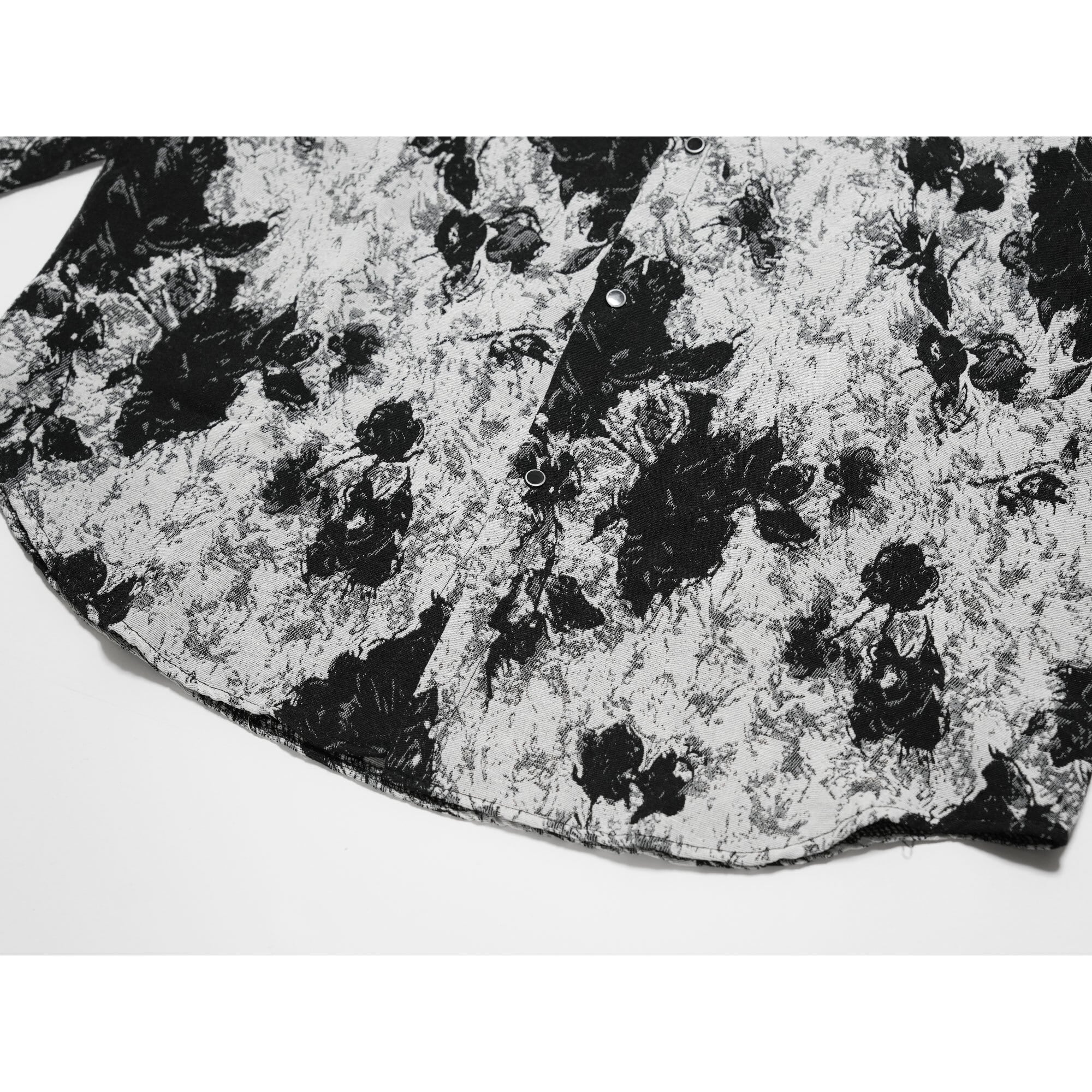 ホワイトとダークカラーのコントラスト鮮やかなフラワーパターンが印象的なデザインシャツ。