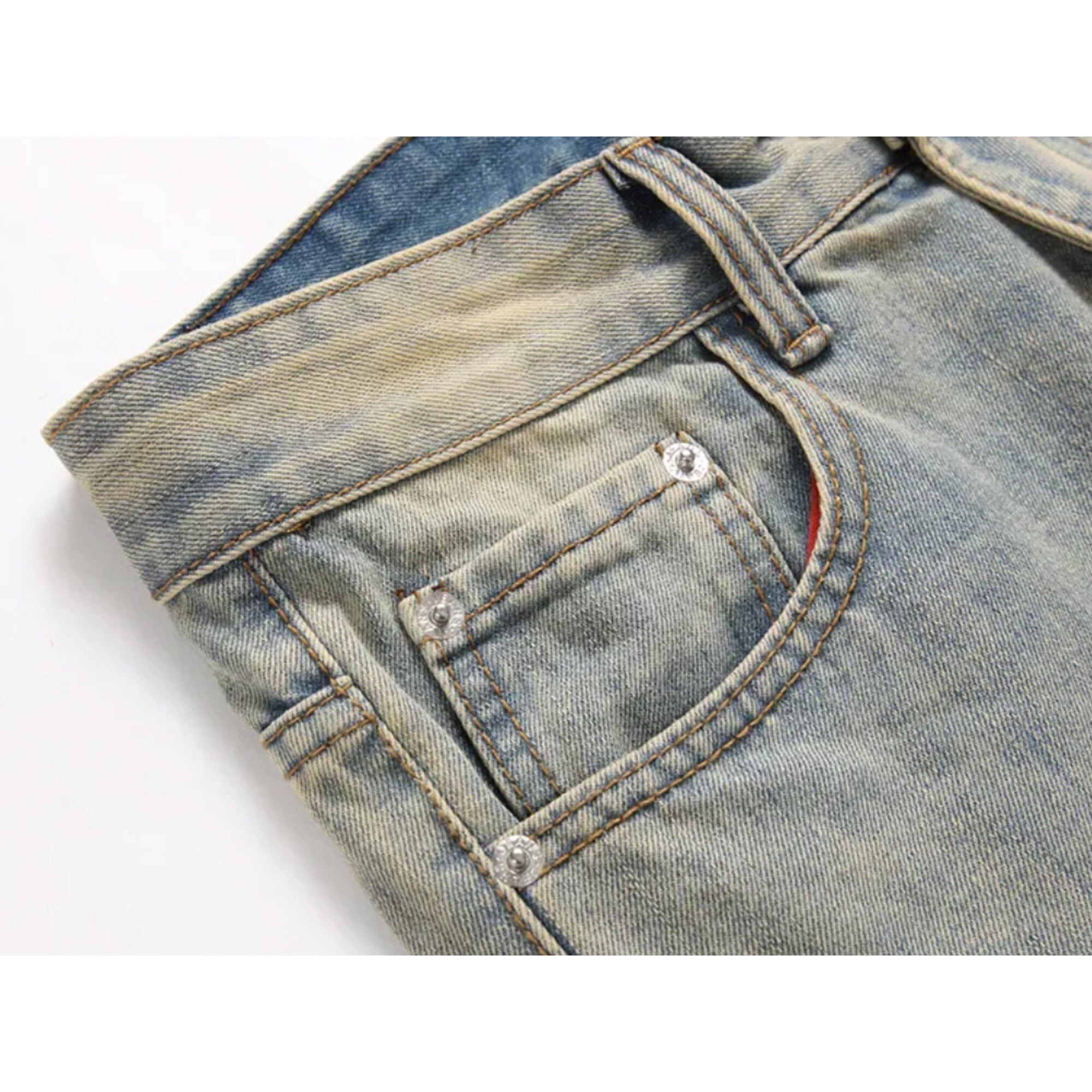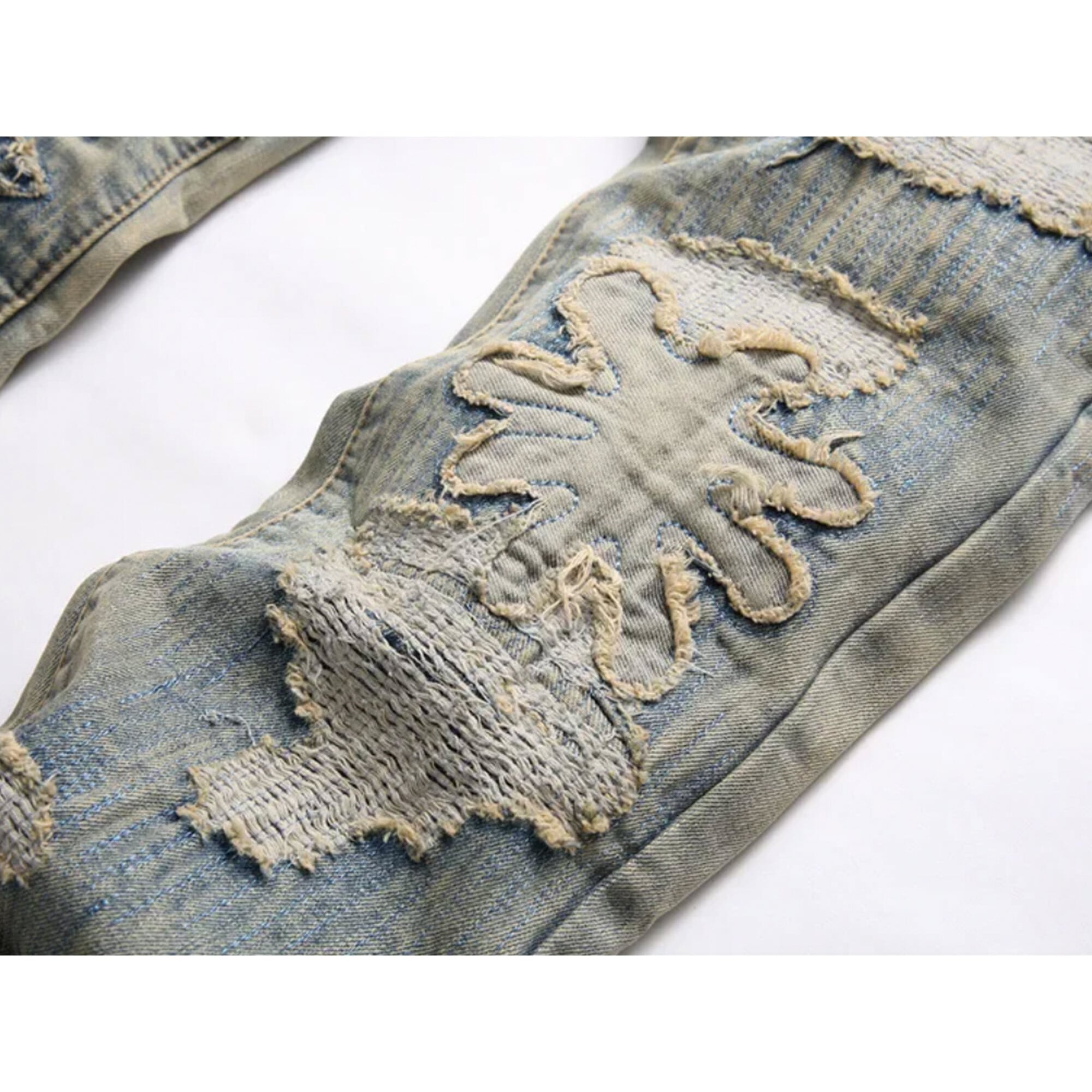 ダメージ加工とフラワーパッチワークがウォッシュドデニムにほどこされたレギュラーデニム。